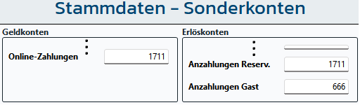 - Es mus unter Stammdaten -> Konten -> Sonderkonten müssen Konten unter Anzahlung Reserv., Anzahlung Gast und Online-Zahlungen eingetragen sein: