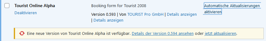 -> Über „Plugins“ -> „Installiertes TouristOnline Plugin“ aktivieren - Das automatische Update wird nicht eingespielt.