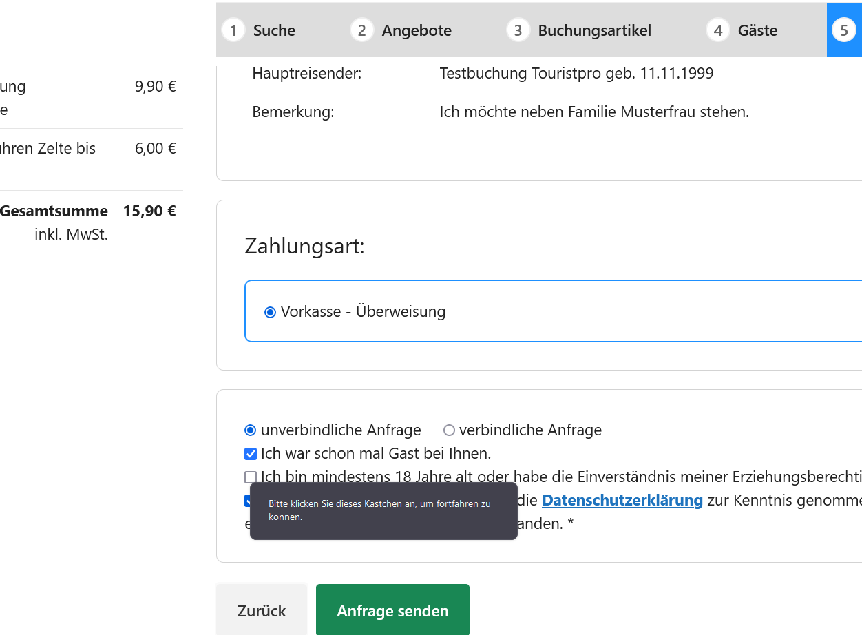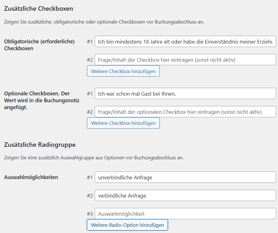 - Möglichkeit zur Anzeige einer zusätzlichen Checkbox vor Buchungsabschluss. Wenn ausgefüllt, erscheint diese nach dem Akzeptieren der AGB/Datenschutz und ist ebenfalls obligatorisch.