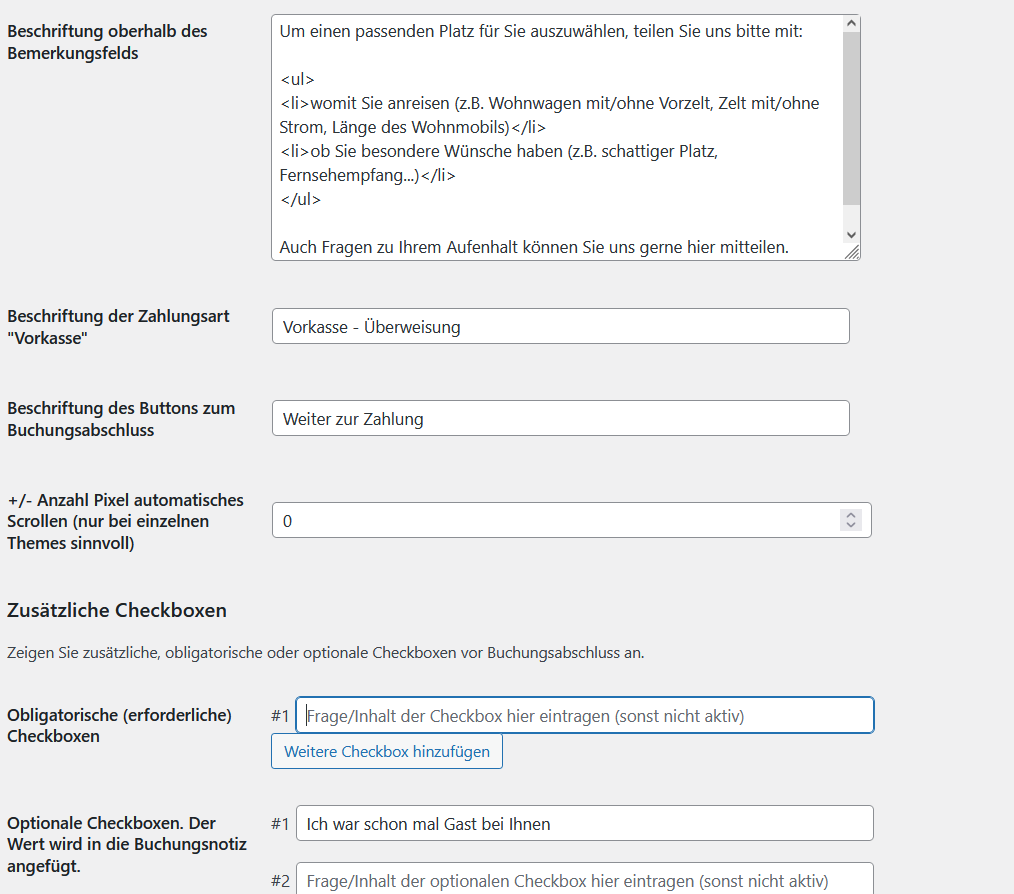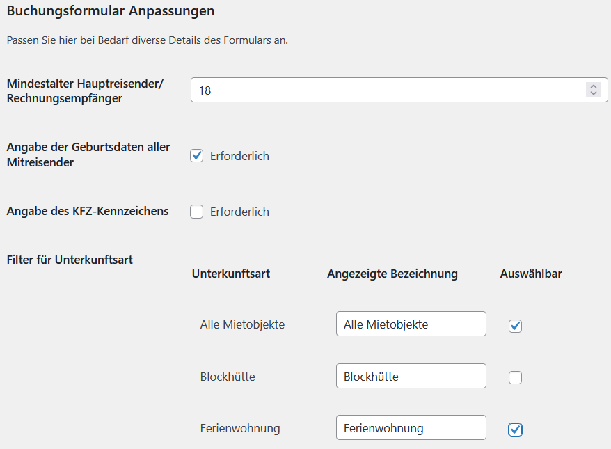 - Beschriftung für Zahlungsart „Vorkasse“, Beschriftung des Buchungsabschluss-Buttons „Weiter zur Zahlung“ sowie die wählbaren Filteroptionen für „Unterkunftsart“ sind nun in den Plugin-Einstellungen anpassbar